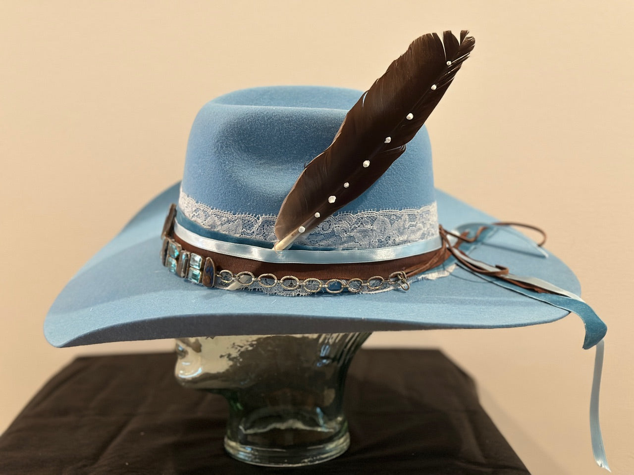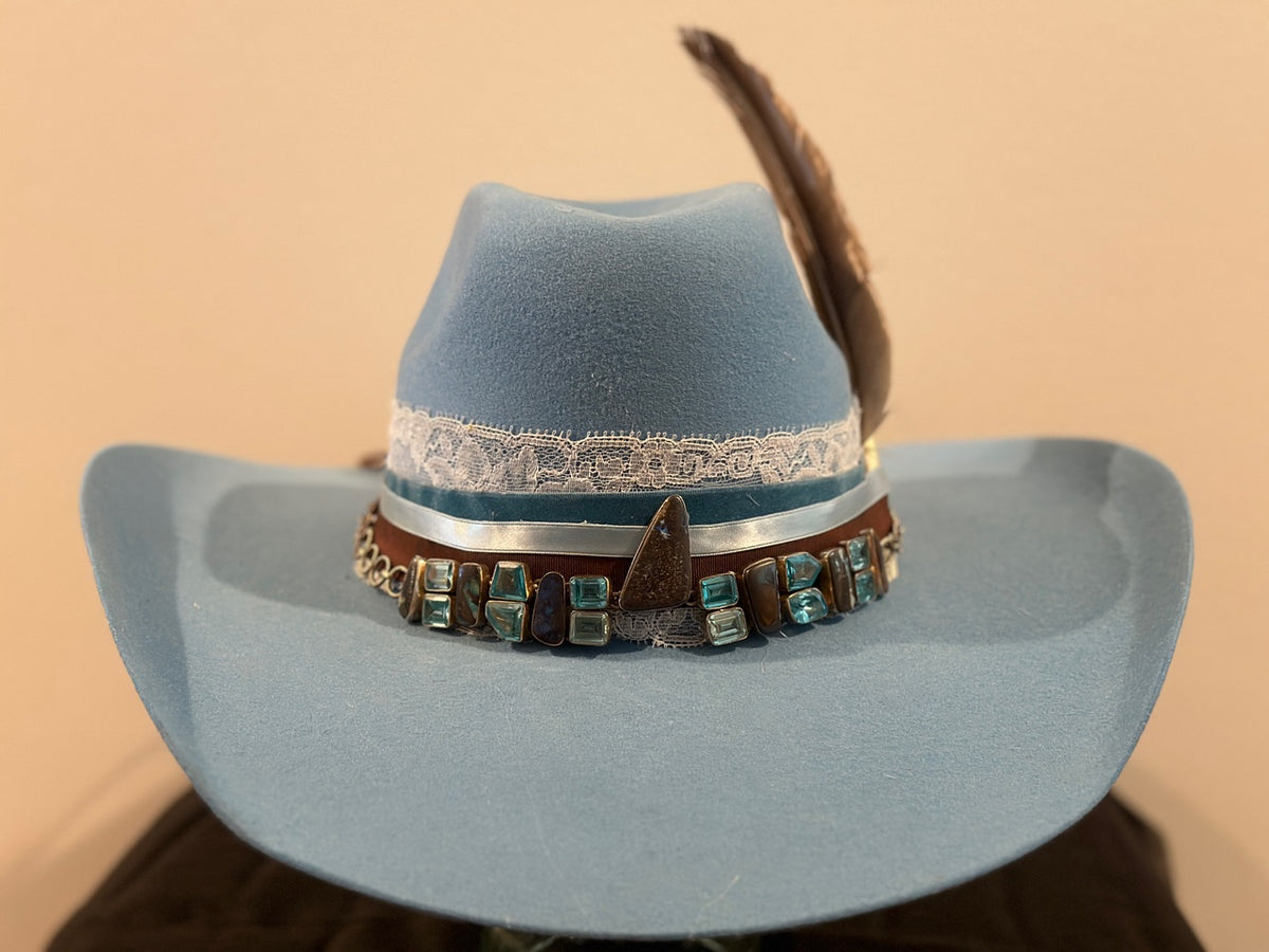 Indulge in elegance and elevate your style with this stunning pale blue cowboy hat. Adorned with a strand of blue topaz and a Colorado opal stone band, this hat adds a touch of luxury to any outfit. The cool blue hue and delicate lace detailing make it a must-have for any fashion-forward individual. Available in a perfect medium size, it offers both comfort and style, making it a statement piece for any wardrobe.