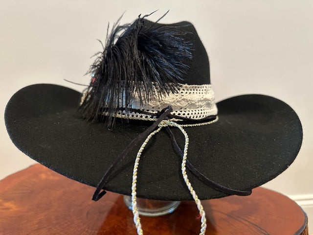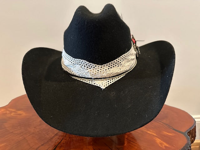 Black wool cashmere cowboy style hat with black and white pearls, a lace band and blue stones on side. Size Medium.