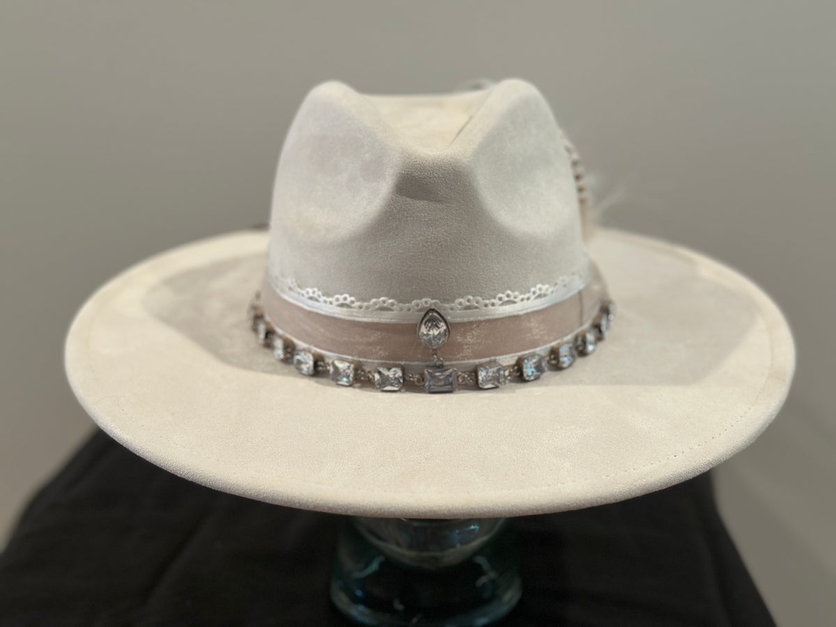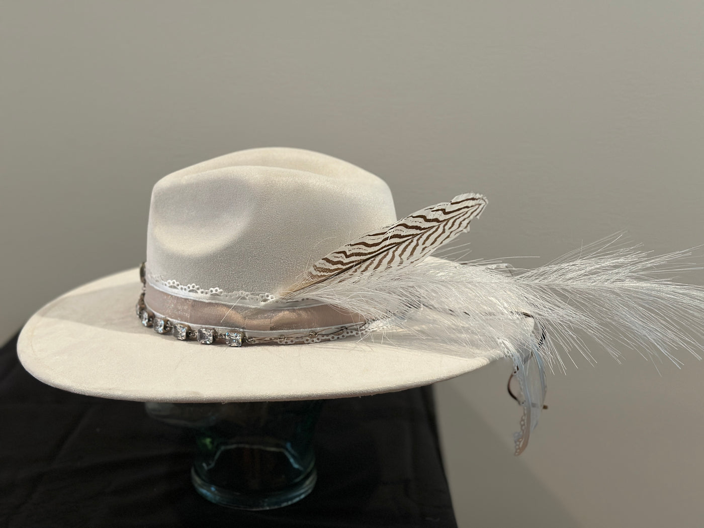 Refresh your wardrobe with our Cowboy Flat Brim Fedora. Crafted from a white Fedora, adorned with shimmering clear stones and a crisp white feather and band. Optimal medium size for an elegant and enduring aesthetic that complements any attire.