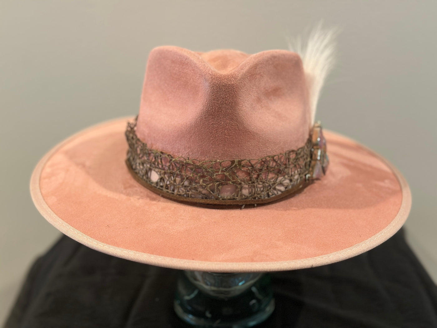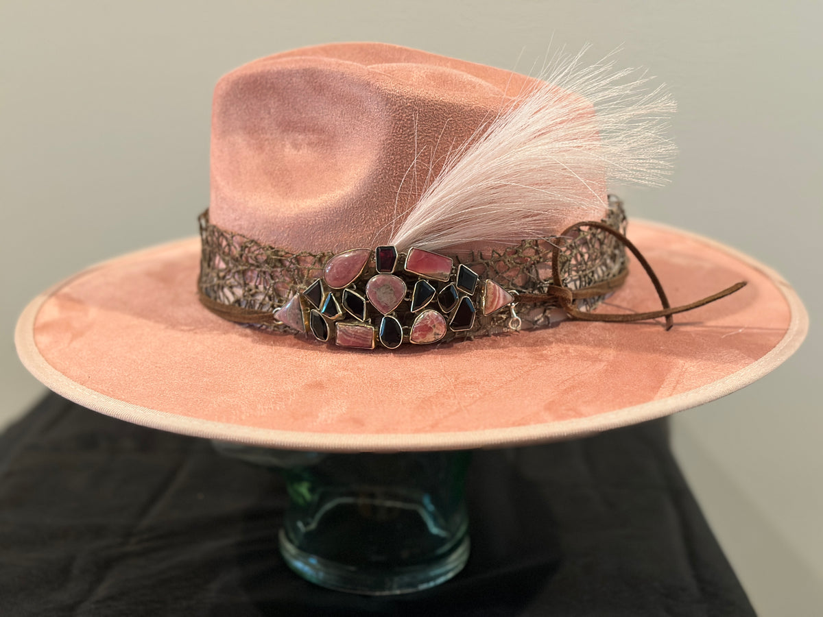 Light pink Fedora with brown band and red garnet and pink, turquoise-colored stones. Size Medium