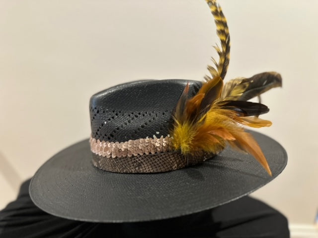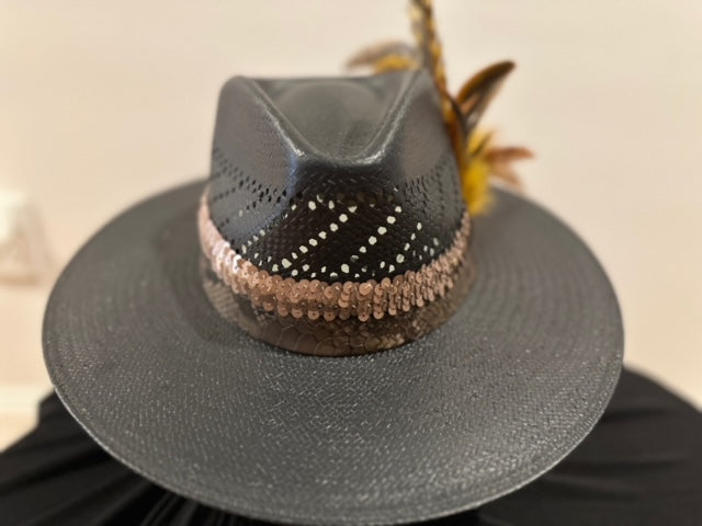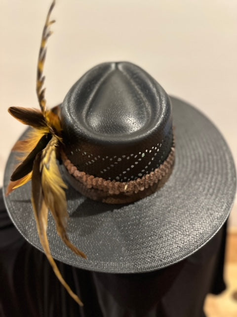 Black cowboy straw Bandora with a flashy band and feathers. It's built to last with durable tight woven straw material. The stylish copper color shiny band and feather accents add a touch of western flair to your look. Perfect for any occasion, this sleek hat will elevate your style while providing protection from the sun.